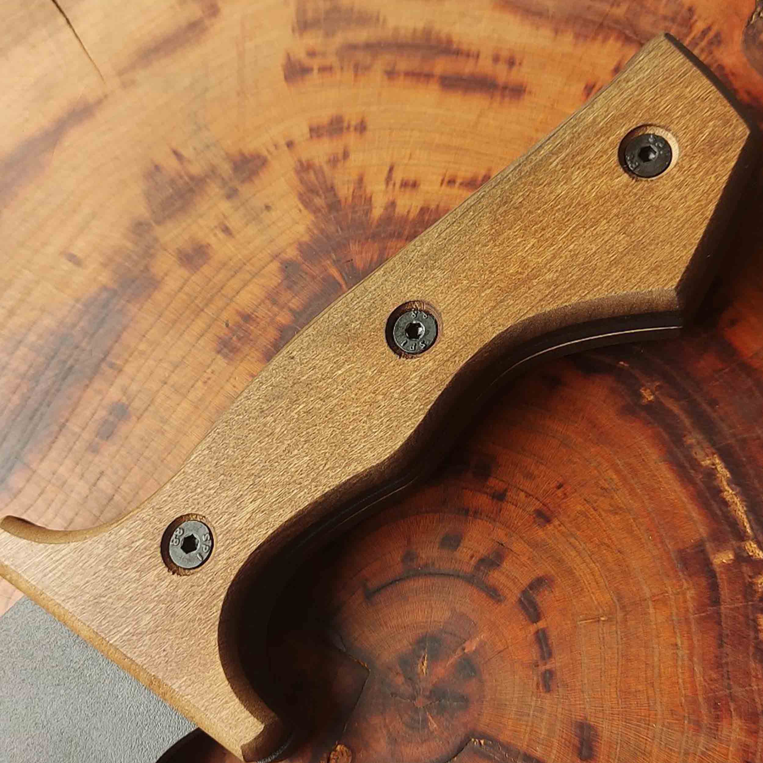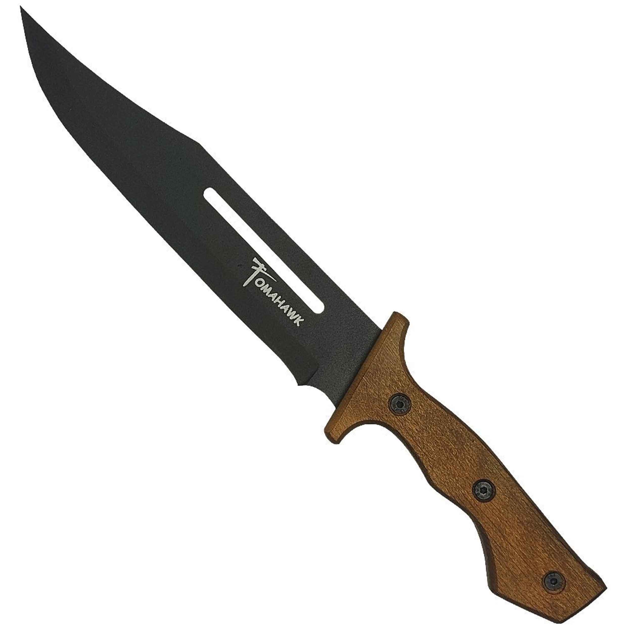 بدنه اصلی چاقو شکاری فولادی توماهاوک به صورت یک تکه ساخته شده است تا بیشترین مقاومت را داشته باشد و دسته اصلی این محصول از جنس چوب گردو درجه یک ساخته ، و بسیار ارگونومیک و خوش دست طراحی شده است. دو بخش و طرفین دسته کارد شکاری توماهاوک با سه عدد پیچ های محکم فولادی به هم متصل شده اند که در صورت نیاز میتوان با کمک آچار آلن آنها را باز و بسته کرد.