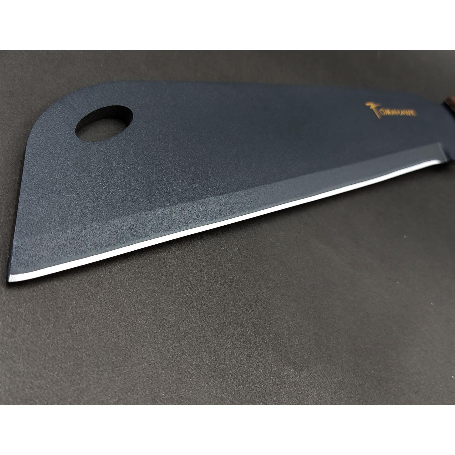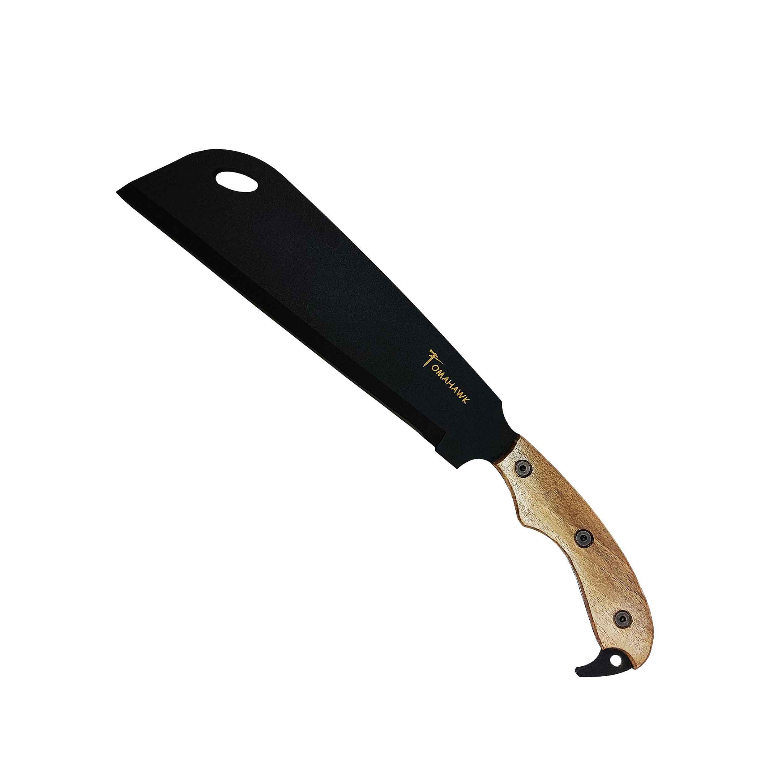 تیغه مورد استفاده در کارد توماهاوک بسیار تیز بوده و با اندود مقاوم به رنگ مشکی ساخته شده . جنس اصلی آلیاژ فولادی با سختی بالاتر از 50 .و در قسمت پایینی این تیغه تیز، حالت هلالی شکل تعبیه شده است تا درزمان استفاده، از سر خوردن دست جلوگیری شود و همچنین ایمنی بیشتر انگشتان، افزایش قدرت ضربات، استفاده راحت با دو دست را به بهترین حالت فراهم کرده است.