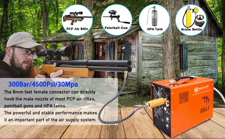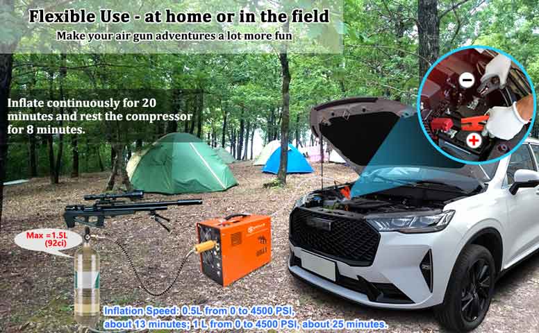 در هر دقیقه 12 لیتر هوا کمپرس می شود و در کوتاه ترین زمان مخازن هدف تکمیل می گردد. بدین صورت که اگر مخزنی با حجم 0.5 لیتر به صورت کاملا خالی داشته باشیم، (که معمولا مخازن تفنگ ها کمتر از این میزان می باشند) ، تا حدود 13 دقیقه از 0 تا 4500psi طول می کشد.